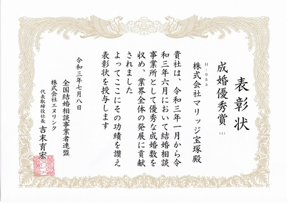 ![]() 全国結婚相談事業者連盟成婚優勝賞受賞 |