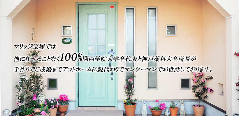安価で手軽な出会い系サイトを試したり、婚活パーティーに参加したり色々な婚活を試してみたが良い結果がでない方に対しマリッジ宝塚は関西圏、阪神間中心の成婚の結果をだすプロ仲人がいる質の高い出会いを提供する結婚相談所です。